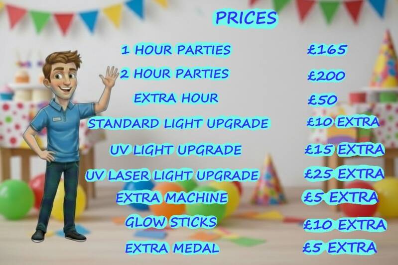 Payment for parties are paid in two half. The first half is paid when you book the party over the phone as a deposit. The second half is paid at the actual party itself, (ideally in cash).